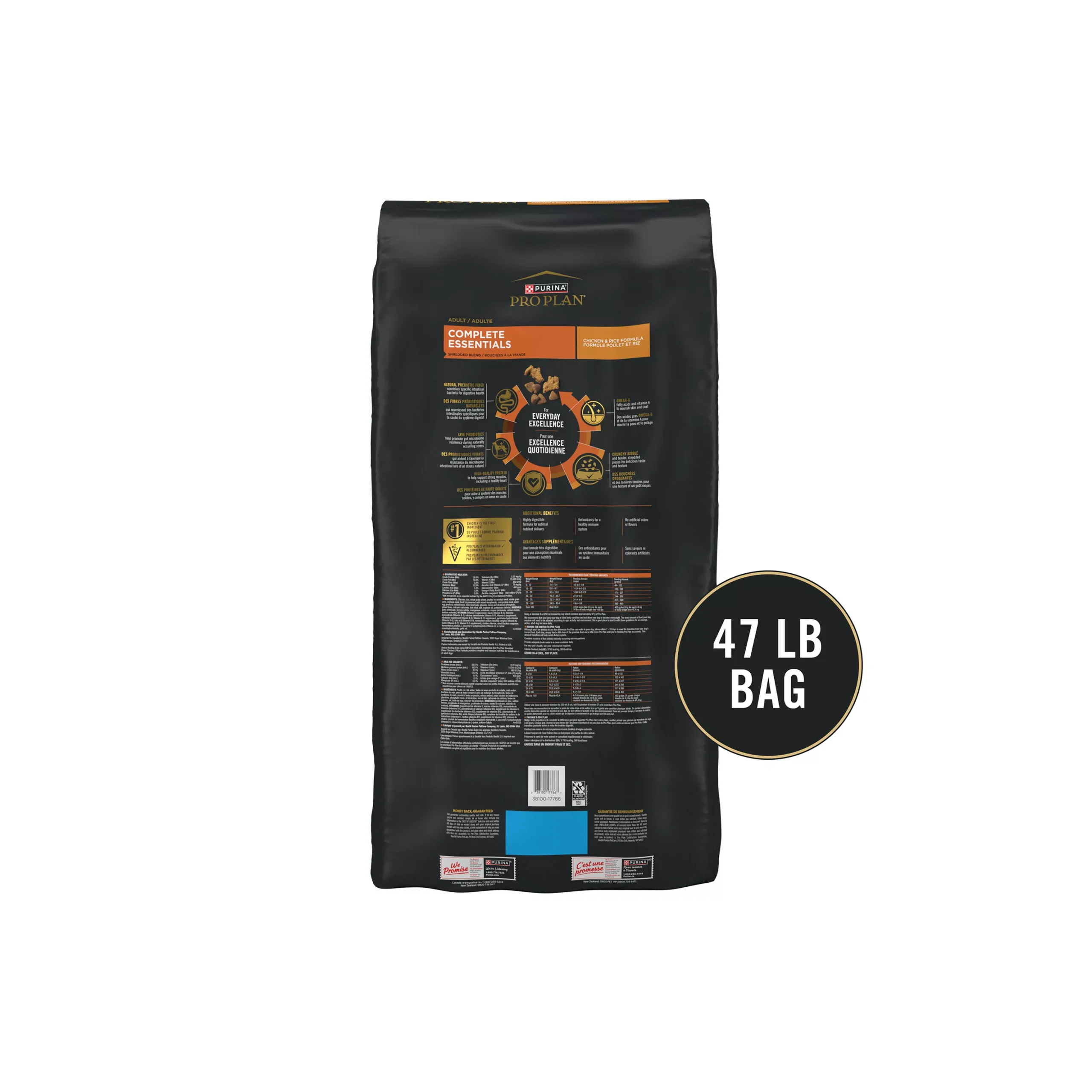 Get your dog excited about mealtime when you serve him Purina Pro Plan Brand Dog Food Shredded Blend Chicken and Rice Formula adult dry dog food. Real chicken as the first ingredient and rice, which is an excellent source of carbohydrates for energy, along with other high-quality ingredients create a wholesome meal with great flavor. The hard kibble and tender shredded pieces provide a texture sure to keep him engaged with every bite. Feel good about serving your dog 100 percent complete and balanced nutrition, and take comfort knowing that each serving contains optimal levels of protein and fat that help dogs maintain an ideal body condition. Vitamin A and linoleic acid, an omega-6 fatty acid, promote healthy skin and coat to keep him looking great, and guaranteed live probiotics help to support his digestive health. Formulated with high-quality protein and other essential nutrients, this Purina Pro Plan COMPLETE ESSENTIALS recipe helps support your beloved pet’s overall health and wellness.